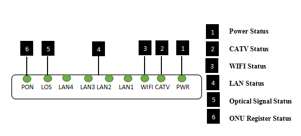 6 | PON | ONU Register | On: Success to register to OLT Blinking: In process of registering to OLT Off: Failed to register to OLT; |