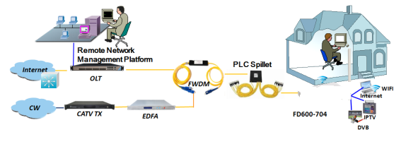It adopts single fiber WDM technology with downlink wavelength 1550nm and 1490nm, uplink wavelength 1310nm. It only needs one-core fiber to transmit data and CATV service.