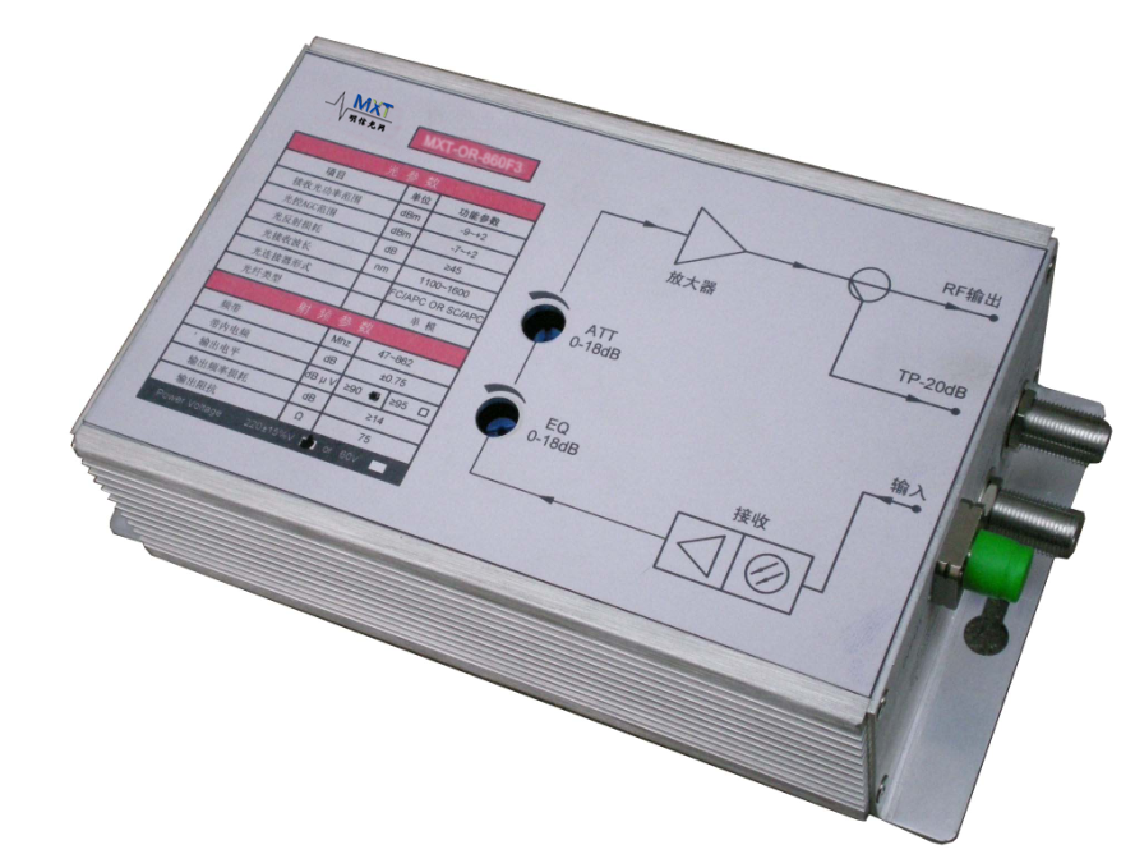 MXT-OR-860F3 FTTB Optical receiver is specially designed to meet the market’s needs. This equipment adopts GaAs MMIC amplifier component reasonably combined with NEC GaAs amplifier module, optimized circuit design and keep the output level stable while input optical power is between -7~+2dbm. It is featured with high performance index; Output adjustable attenuation and equalization makes the debugging of CATV network project very conveniently. It’s first recommended equipment to build HFC network system.