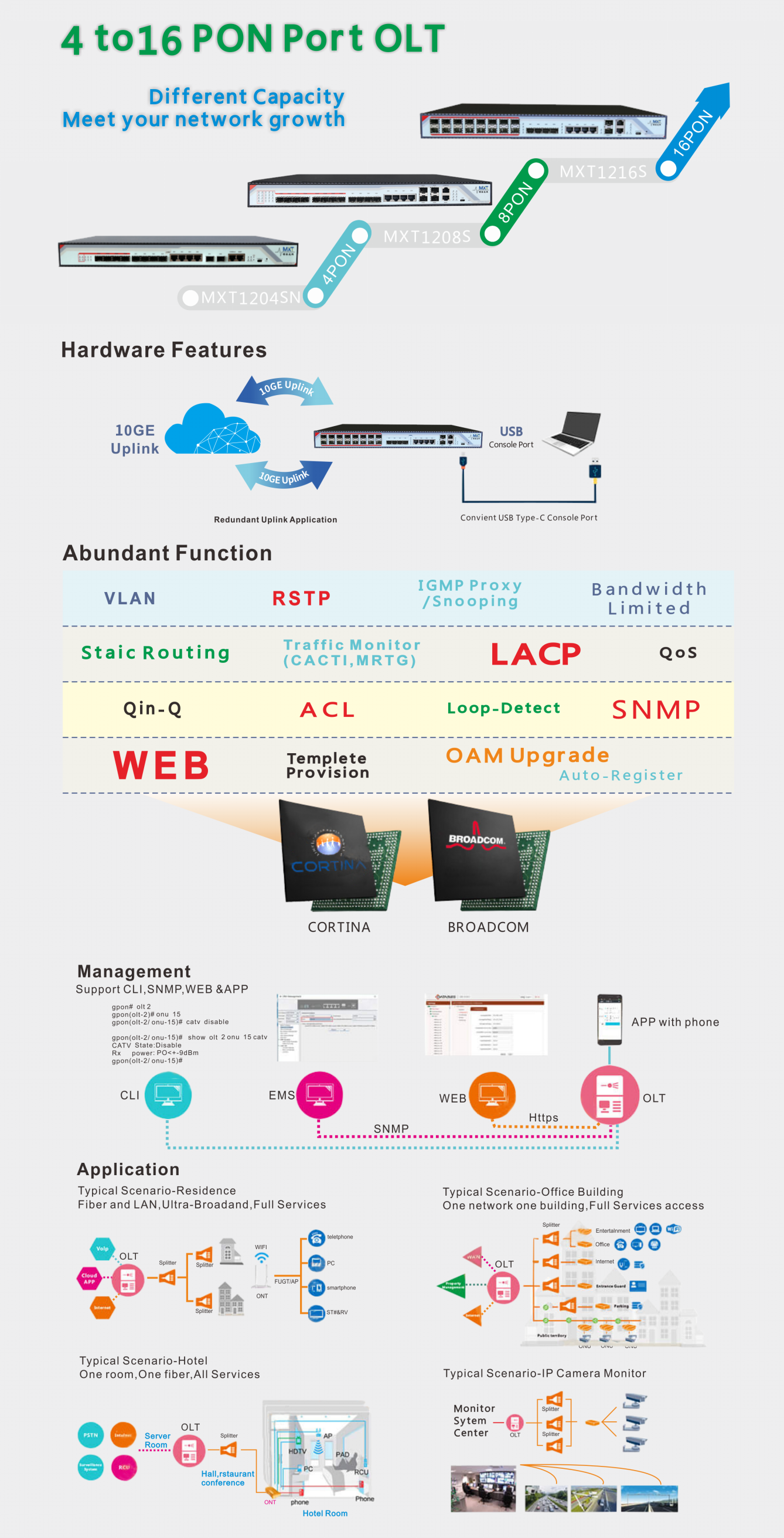 The OLT can use for “Triple-Play”, CPN, IP Camera, Enterprise LAN and IOT applications. It is a high performance products.